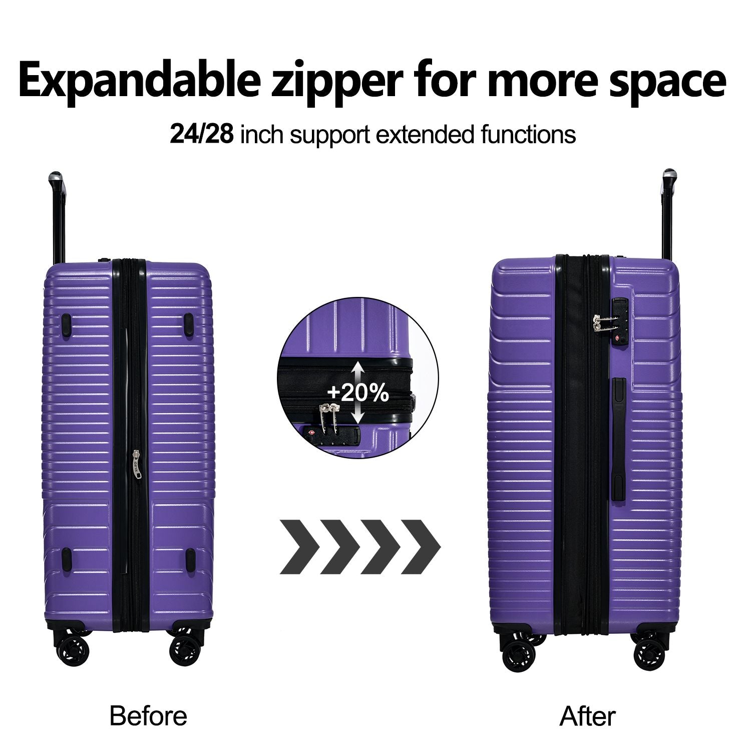 Expand 20% for more space-only for 24/28 inch. The Handle can be adjusted in three levels of telescopic height to meet the needs of users of different heights.