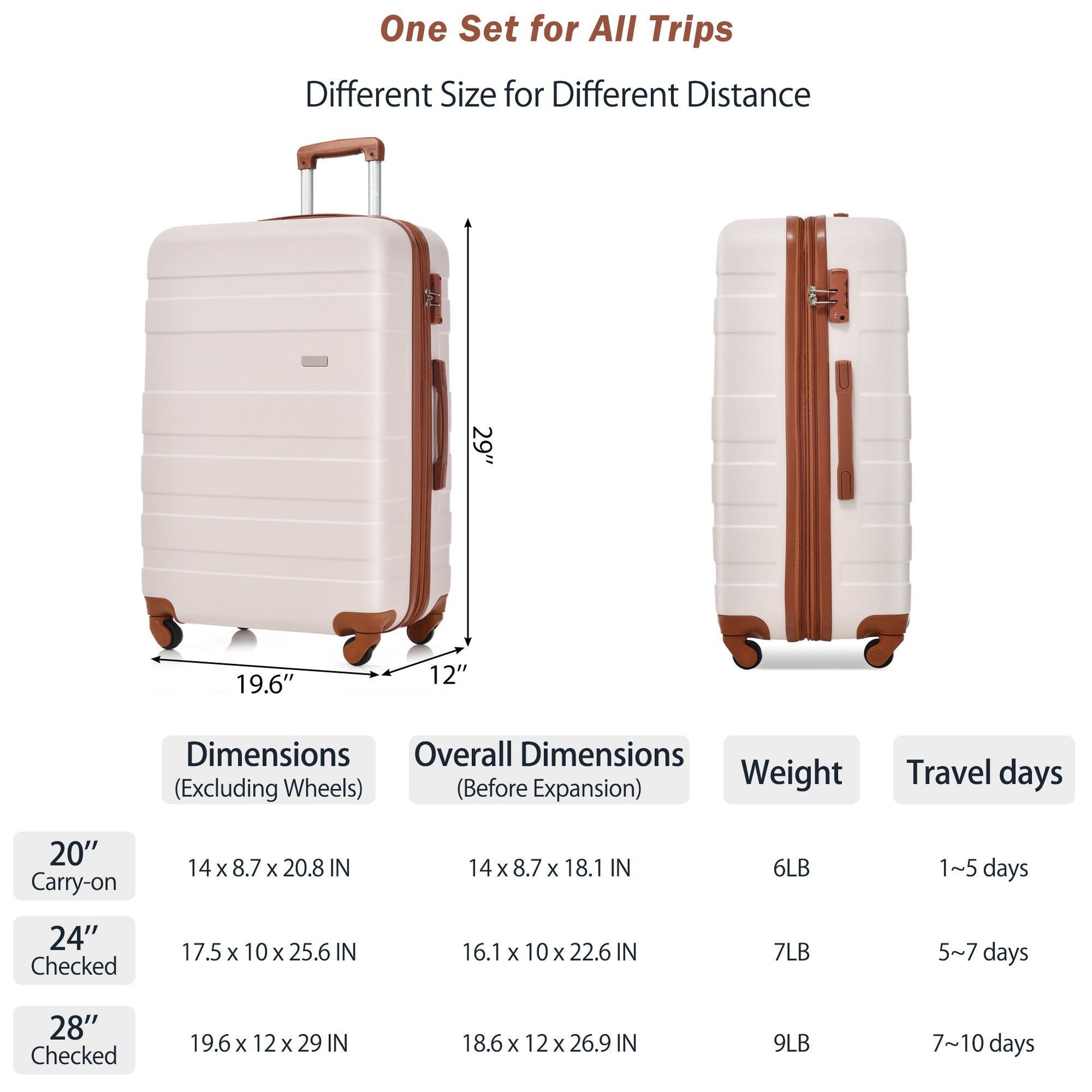 [3 Piece Luggage Set]: 20 ''(convenient to carry to the aircraft), 24", 28 "are expandable, adding 25% space capacity for hardshell luggage.