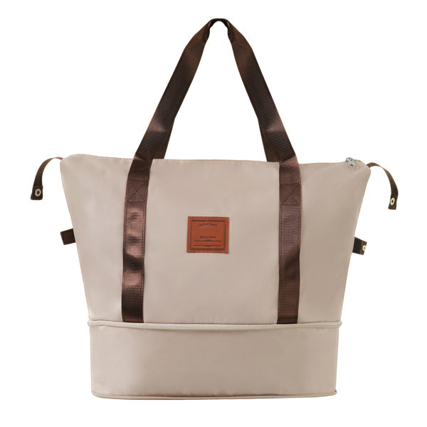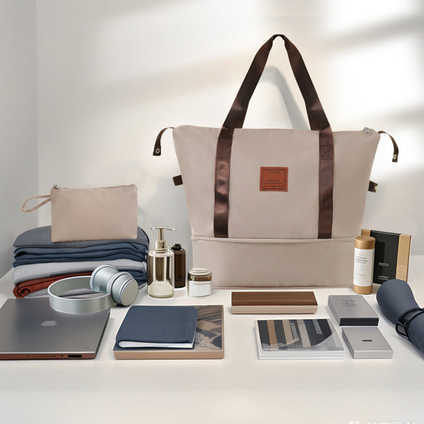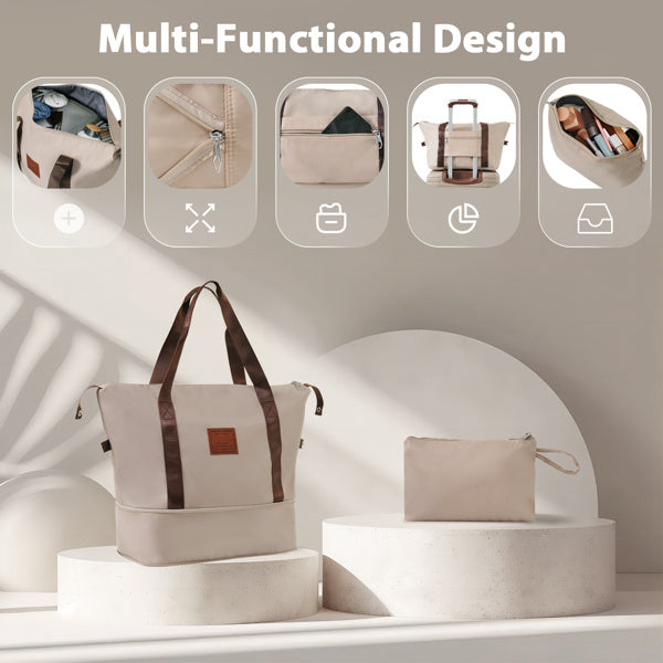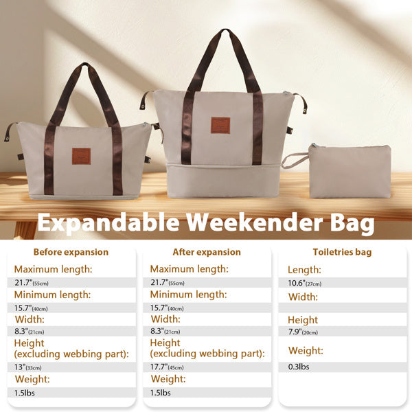 Expandable duffel bag dimensions (front shape is trapezoidal): longest length: 21.7", shortest length: 15.7", width: 8.3", height: 13", expanded height: 17.7". The duffel bag comes with a trolley sleeve with zippered pocket, and you can conveniently attach it to the adjustable handle.