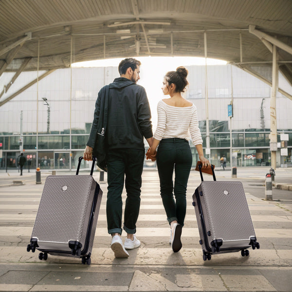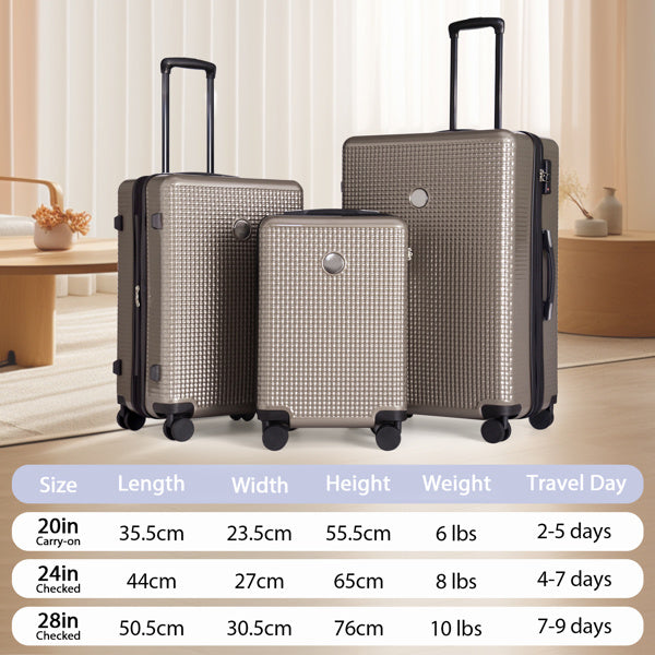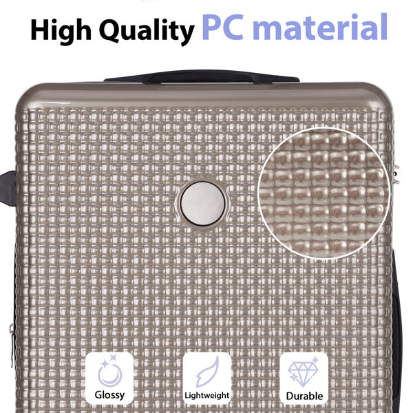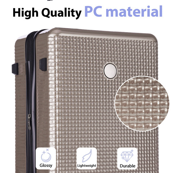 Luggage set is made of ABS+PC material, which is light and strong, flexible and impact-resistant, and can withstand extrusion and collision during transportation. The surface of the suitcase is covered with regular dot patterns and has a beautiful gloss.