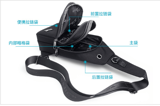 3.Product structure:It contains main bag, internal dark bag, front zipper bag, front carrying bag, back zipper bag .
